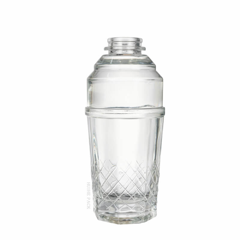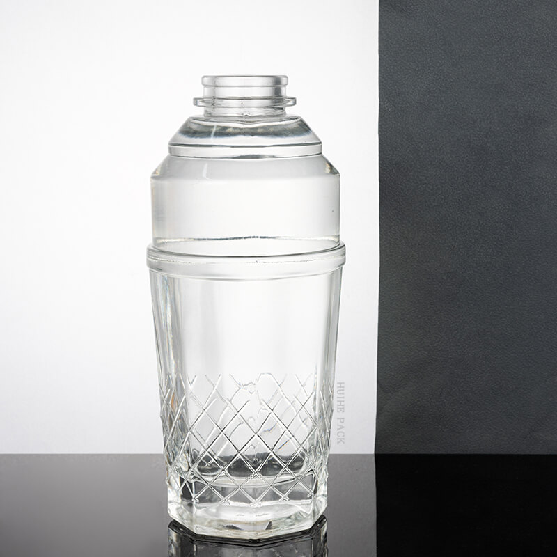 La partie inférieure de la bouteille présente une texture à motifs de diamant complexe, ajoutant une touche d'élégance et d'intérêt visuel. Ce modèle améliore non seulement l'attrait esthétique, mais fournit également une meilleure adhérence. Le cou est court et soigneusement intégré dans la section supérieure, créant un look cohérent. Si vous recherchez 'des bouteilles d'alcool en verre uniques ' qui se démarquent sur le marché, cette conception est une excellente option.