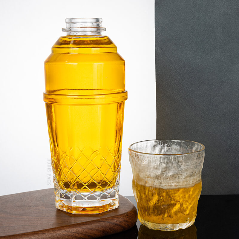 Cette bouteille d'alcool en verre dispose d'un design distinctif qui combine le style et les fonctionnalités. Ressemblant à un shaker à cocktail, il a une structure en deux parties. La partie supérieure est une section de capuchon arrondie - qui se transforme en douceur dans le corps principal ci-dessous. Ce corps est cylindrique avec un fond légèrement effilé, lui donnant un aspect stable et équilibré.