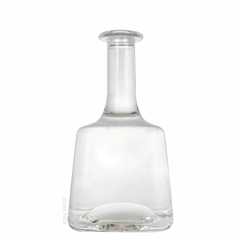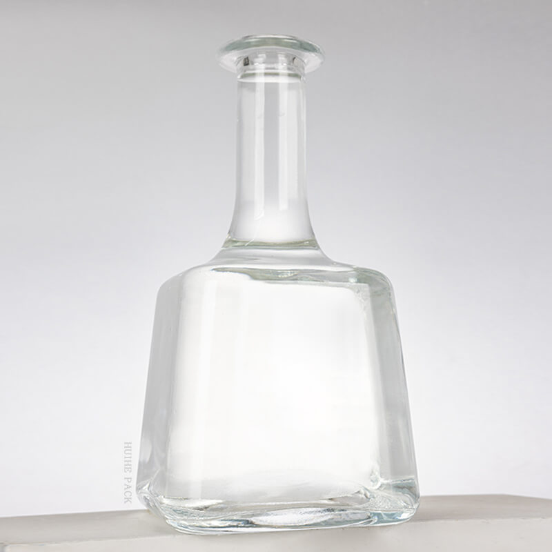 Le cou de la bouteille est grand et mince, s'élevant gracieusement du haut du corps trapézoïdal. Il a une transition lisse et transparente, conduisant à une petite ouverture circulaire qui est parfaite pour verser et installer un bouchon. La silhouette globale de la bouteille est élégante et sophistiquée, ce qui en fait un choix remarquable pour les esprits premium. Si vous êtes à la recherche de 'bouteilles d'alcool en verre modernes ' pour élever votre marque, cette conception est un excellent ajustement.