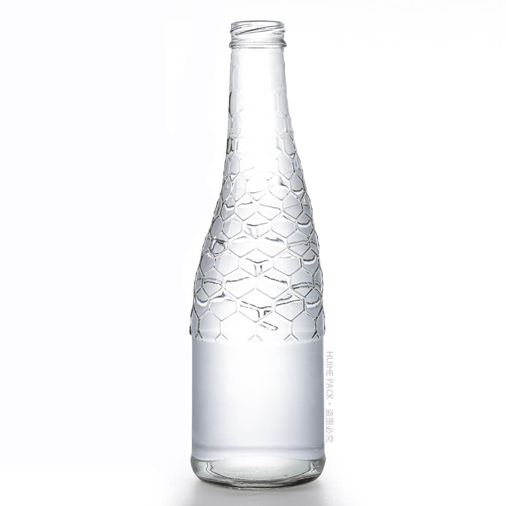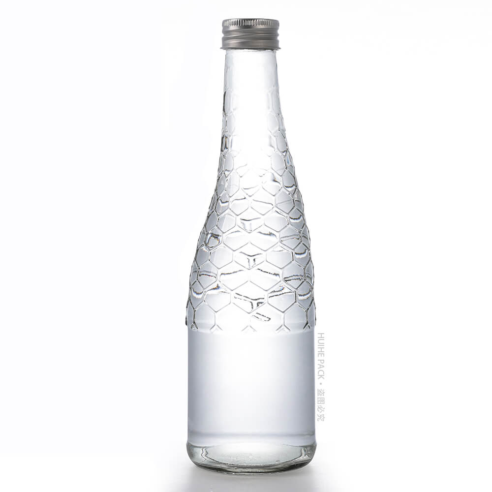 Cette bouteille d'eau en verre de 330 ml présente un design unique et accrocheur : elle mesure 223 mm de haut avec un diamètre de base de 65 mm, présentant une forme effilée associée à un motif en nid d'abeille texturé sur la moitié supérieure et une partie inférieure givrée. Ce mélange de détails lui donne un look luxueux et distinctif, parfait pour les marques d'eau minérale haut de gamme souhaitant se démarquer.