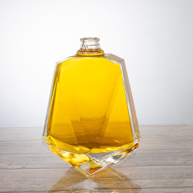 Cette bouteille d'alcool en verre présente une conception géométrique frappante qui se détache de l'ordinaire. Son corps angulaire et à facettes ressemble à une pierre précieuse précieuse, avec des lignes nettes et plusieurs plans qui attrapent et reflètent la lumière de manière fascinante. La forme unique lui donne une apparence moderne et énervée, ce qui en fait une conversation - Starter. Si vous êtes à la recherche de 'bouteilles d'alcool en verre inhabituelles ' pour distinguer votre marque, ce design est un choix parfait pour attirer l'attention des consommateurs.