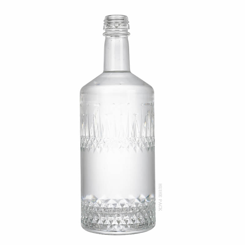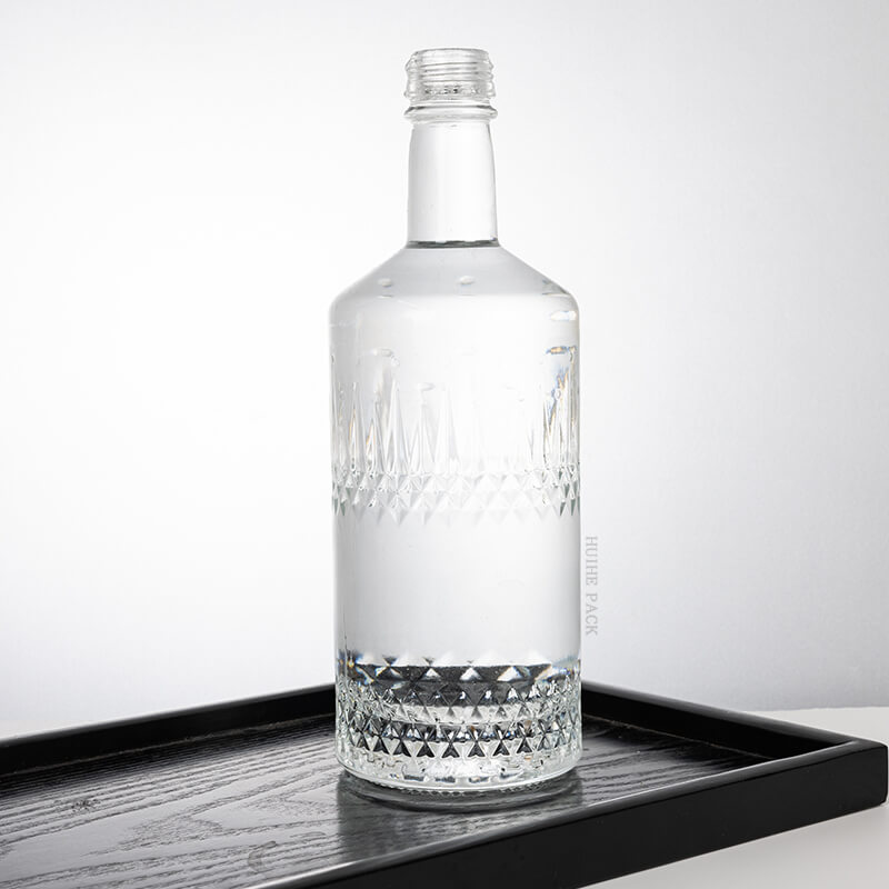 Cette bouteille d'alcool en verre présente un design captivant qui combine l'élégance classique avec un flair moderne. Son corps présente des gravures à motifs de diamants complexes qui attrapent et reflètent la lumière, créant un effet visuel éblouissant. Les sections supérieures et inférieures de la bouteille sont ornées de ces motifs élaborés, tandis que la partie centrale offre une zone lisse et dégagée qui peut mettre en évidence le logo que vous avez personnalisé. Ce mélange harmonieux de savoir-faire détaillé et d'espace minimaliste en fait un spectacle - un bouchon sur n'importe quelle étagère.