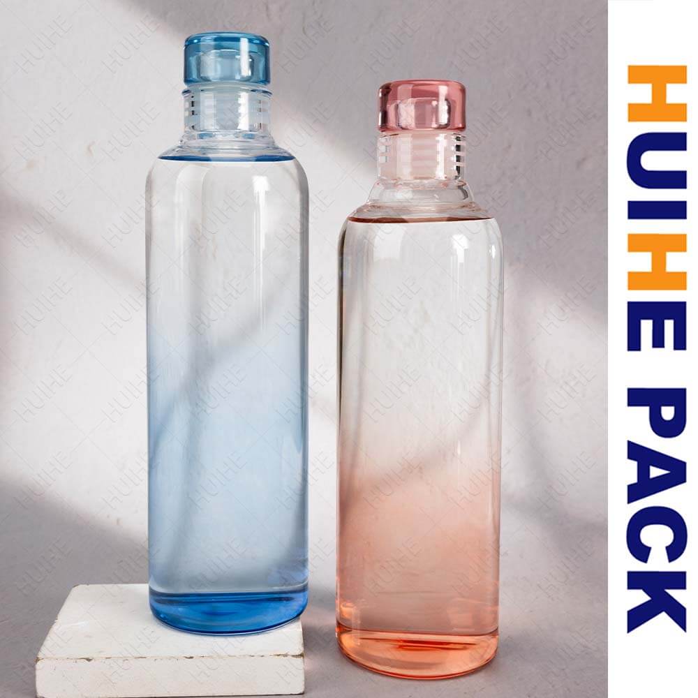 Cette bouteille d'eau en verre borosilicaté a une forme cylindrique allongée et élégante, disponible dans des finitions teintées dégradées (transparent, bleu, pêche, gris foncé) qui ajoutent une touche moderne et élégante. Le col lisse s'associe à un capuchon teinté assorti pour un look cohérent.