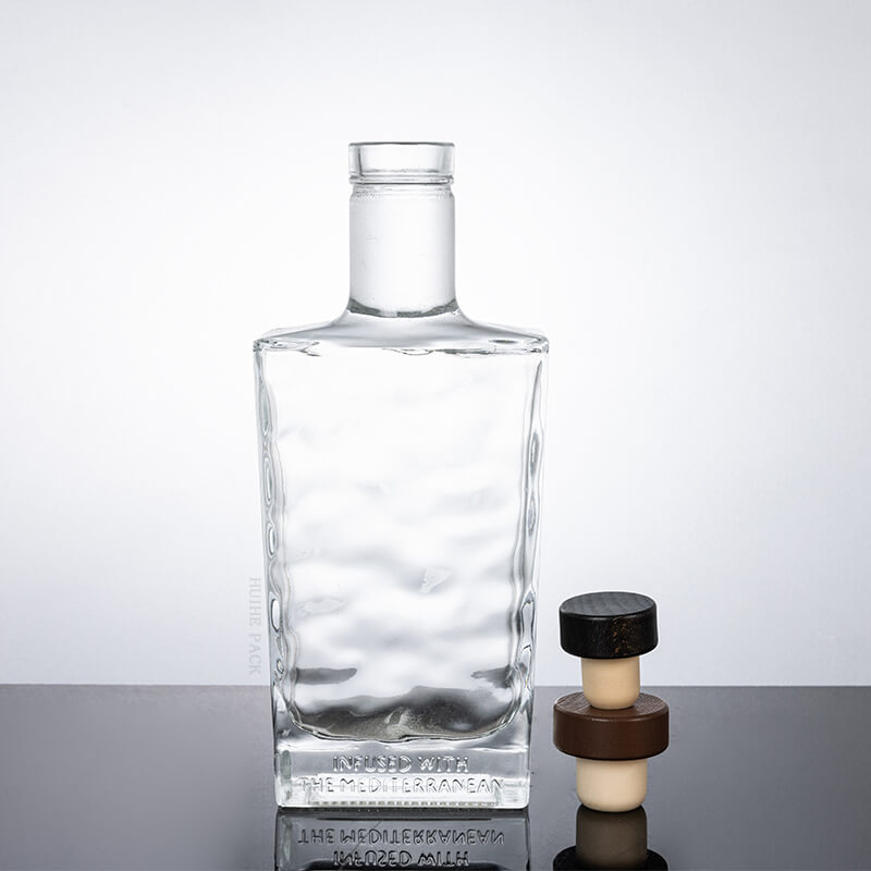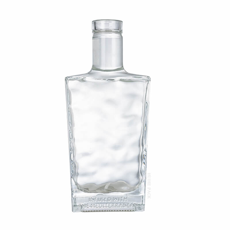 Cette bouteille d'alcool en verre présente un design innovant qui le distingue sur le marché. Sa forme rectangulaire avec une surface texturée et ondulée lui donne une allure tactile et visuelle, rappelant les ondes méditerranéennes comme indiqué par le texte gravé 'infusé de la Méditerranée '. Le cou lisse et allongé ajoute une touche d'élégance, ce qui en fait un mélange parfait de modernité et de sophistication. Si vous recherchez 'des bouteilles d'alcool en verre uniques ' pour faire briller votre marque, ce design est un choix captivant.